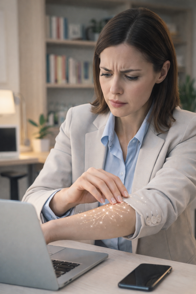 - The “Digital Twitch”: Overexposure to blue light and constant notifications keeps our nervous system in a state of hyper-arousal, leading to “phantom” skin sensations like itching or tingling.
